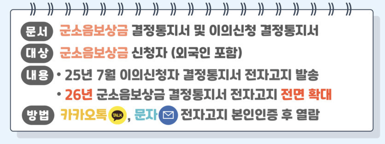 2026년부터는 군소음보상금 안내문과 이의신청 결정통지서까지 모바일 전자고지 방식을 확대 적용할 계획입니다. 이를 통해 행정 효율성을 높이고 주민들이 보상 절차를 더욱 간편하게 확인할 수 있도록 할 방침입니다.